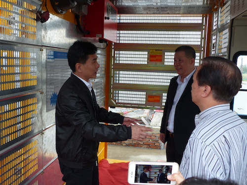考察完車間、產(chǎn)線,領(lǐng)導(dǎo)們一行來到產(chǎn)品展示區(qū),何區(qū)長走進吊籠,對產(chǎn)品有關(guān)部件進行的細致的詢問,并對安全生產(chǎn)進行了著重強調(diào)。
